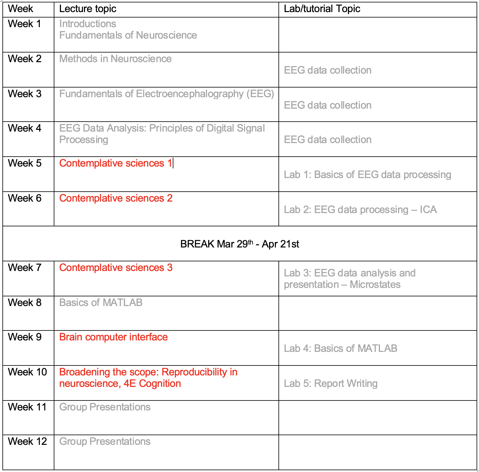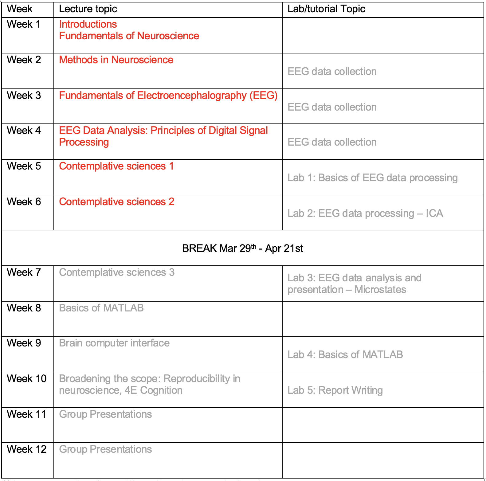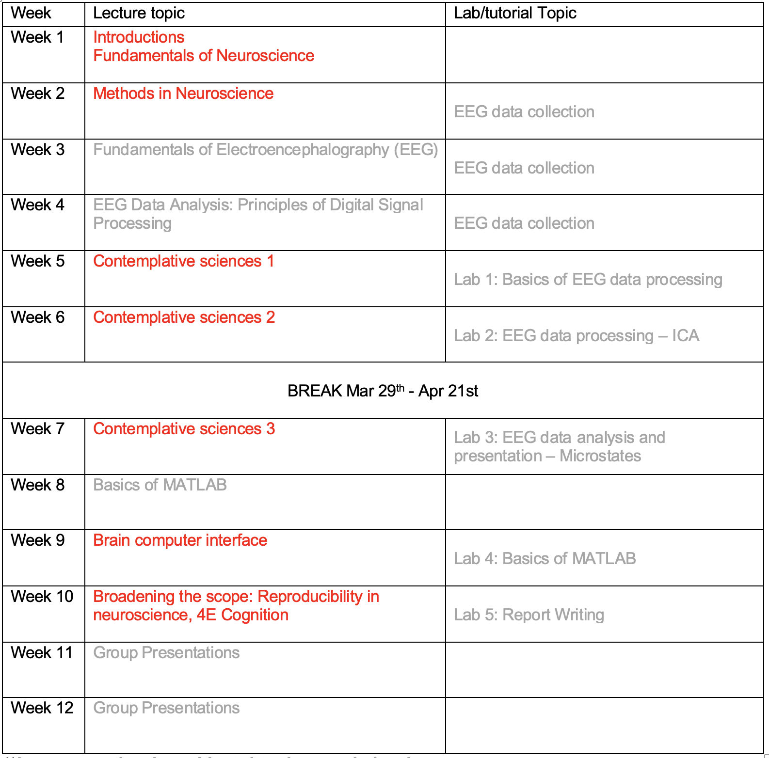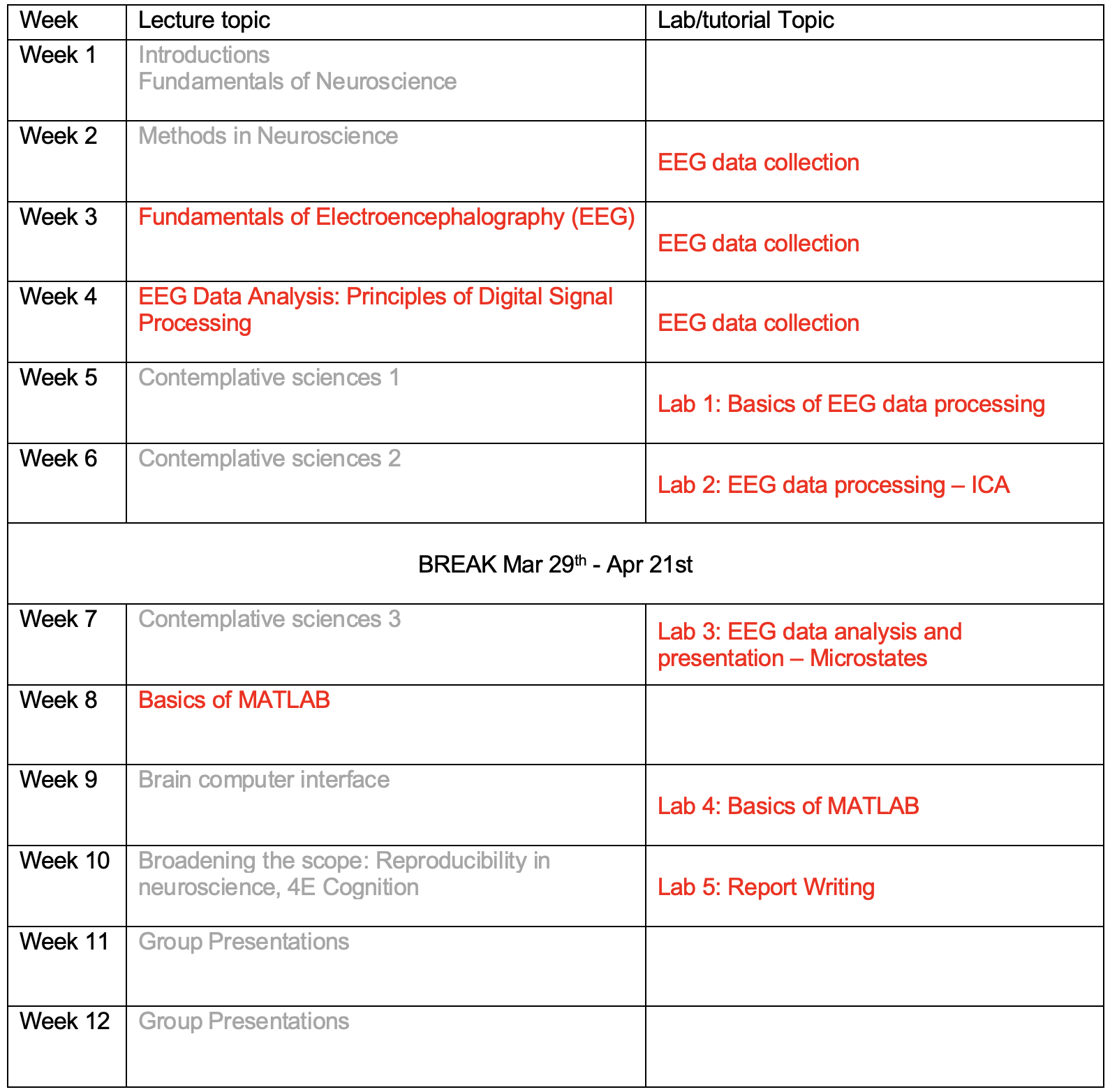 The first four weeks are dedicated to data collection, so there are no labs, and you will collect data using EEG headset, that you will process and analyze for your Individual Lab Report assignment. Please note that you cannot write the Individual Lab Report unless you have your own EEG data. This being the case, the first four weeks are important for your 15% Individual Lab Report.