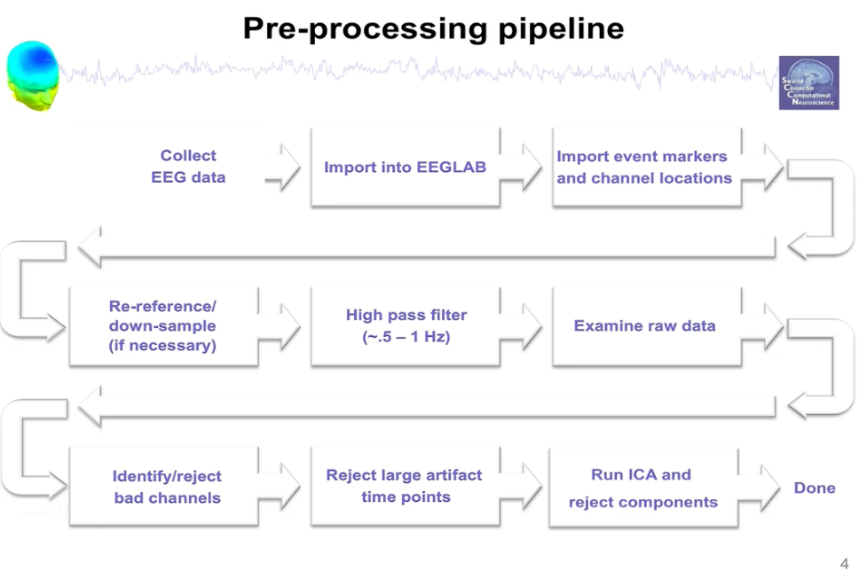 - Remove artefacts, make sure you have enough data (20 * square of number of channels), high pass filter at 0.5, remove bad channels.